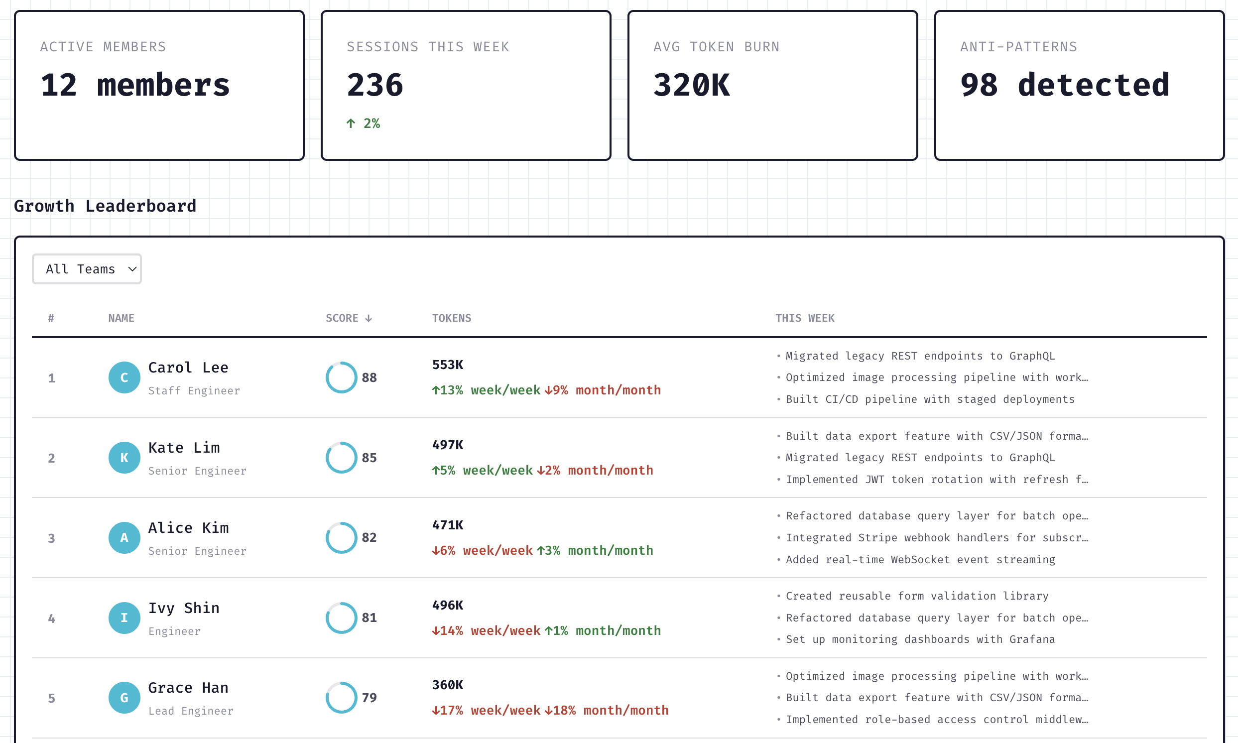 See every engineer's AI sessions, token consumption, and efficiency scores in one dashboard. The growth leaderboard ranks your team by improvement trajectory - not just raw output.
