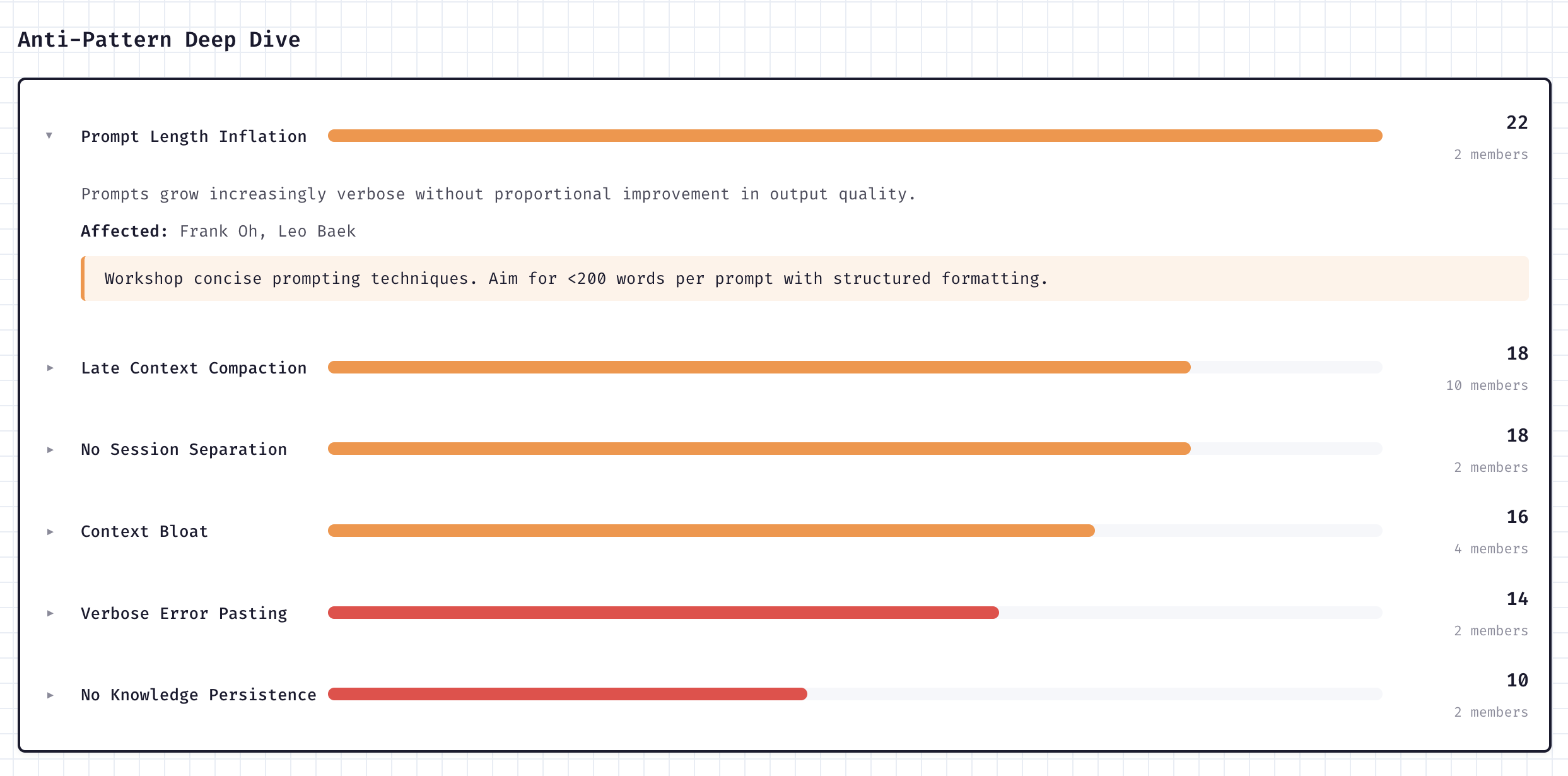 Automatically surface team-wide anti-patterns like prompt inflation, context bloat, and verbose error pasting. See who’s affected and get actionable recommendations.