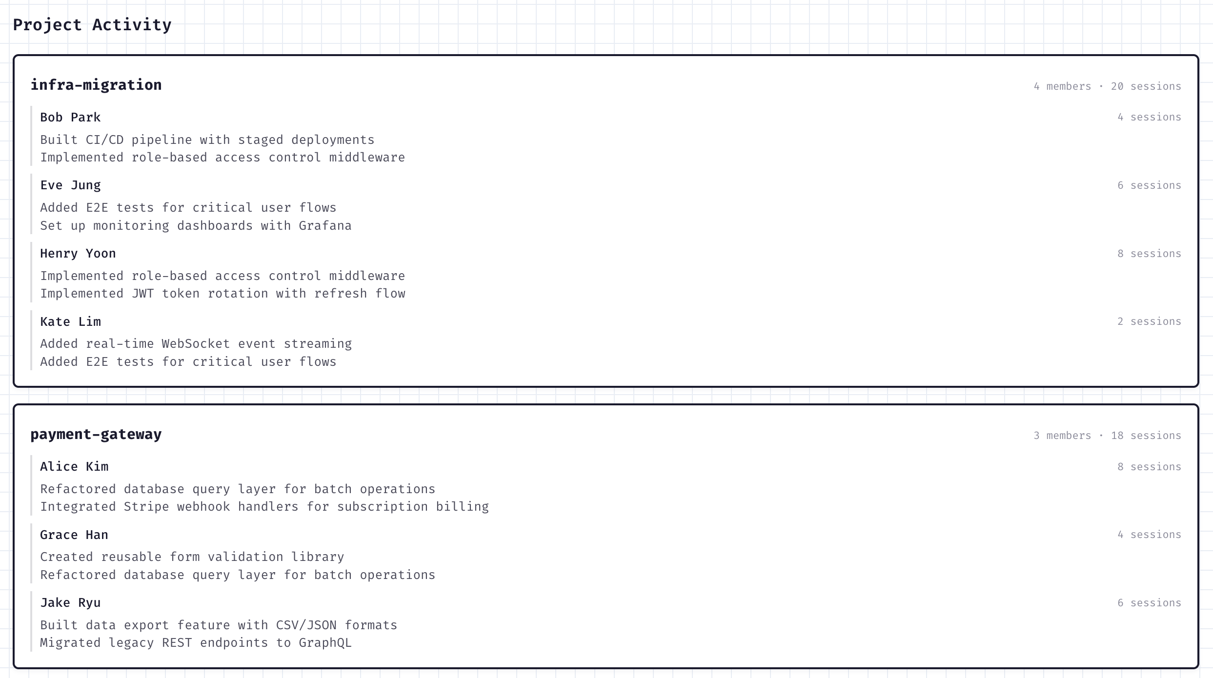 Know who built what across every project - without status meetings. Session data maps to repositories and shows each contributor's work alongside their session count.